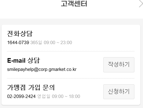 - 이메일 상담: smilepayhelp@corp.gmarket.co.kr