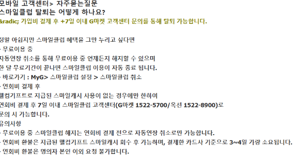 스마일페이와 달리, 스마일클럽은 연회비가 있는 유료 멤버십 서비스입니다. 스마일클럽 해지 및 환불 조건은 다음과 같습니다: