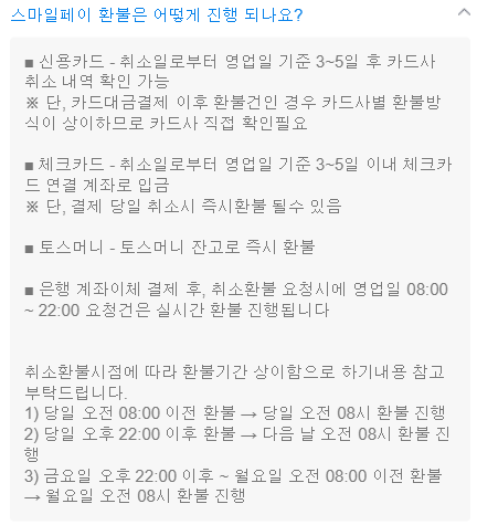 - 스마일캐시: 취소 완료 후 즉시 환불됩니다.
