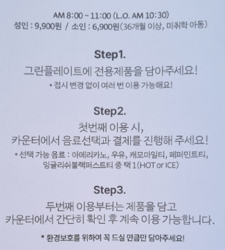 지난 주말, 친구랑 뚜레쥬르 그린플레이트 빵뷔페에 다녀왔어. 1시간 동안 빵 무제한에 음료 한 잔까지 포함되어 있어서 기대를 안고 갔지. 입장료는 성인 기준 9,900원이었어.